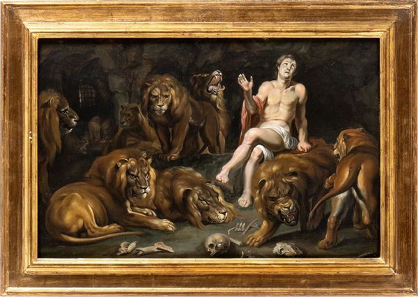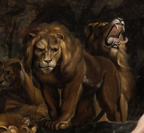 Questa suggestiva composizione rappresenta la storia biblica in cui il profeta Daniele viene gettato nella fossa dei leoni, rimanendo miracolosamente illeso grazie all'intervento divino che sigilla le fauci dei felini (Libro di Daniele, capitolo 6). Il nostro dipinto deriva chiaramente, ma con significative e cospicue varianti (in particolare sulla figura di Daniele), dalla celebre di analogo soggetto realizzata da Peter Paul Rubens intorno al 1615 e oggi presso la National Gallery of Art di Washington.