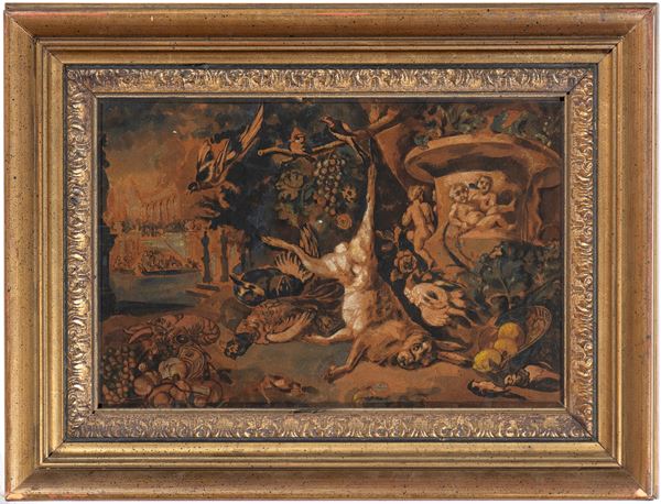 Fruit still life with game and hare hanging on a branch