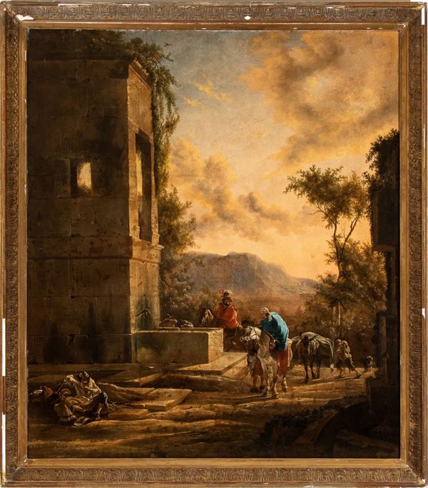 In this large canvas we find some of the typical motifs of Weenix's poetics: from his fascination with the warm Mediterranean light, which spreads golden in his paintings to illuminate the depiction of the landscape, the motifs of the horsemen's pause at the fountain, the beggars lying along the dusty roads, and the classical or rustic ruins that dot the Roman countryside. Our painting can be likened to Weenix's Works such as Landscape with Horseman at a Votive Chapel at the Brukenthal Museum in Sibiu, or Italian Landscape with Horsemen's Stop at a Fountain at the Centraal Museum in Utrecht.