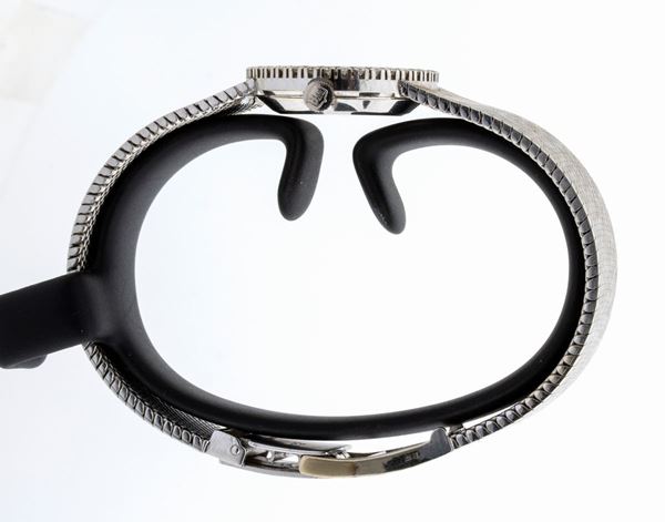 18K white gold case and integrated bracelet, silvered dial with Roman hour markers and black hands signed Asprey and Arabic numerals, bezel set with 39 huit-cut diamonds totalling approximately 0.80 ct. Manual-winding Baume & Mercier BM 775 calibre movement. Hallmarked on the clasp: " 750 - 10 MI", on the inside of the case back Baume & Mercier and Birmingham import marks in 1972-73, on the outside 457470 36647T2 and gold marks.