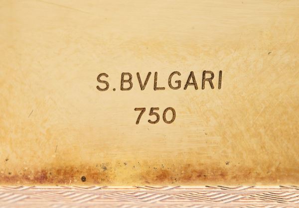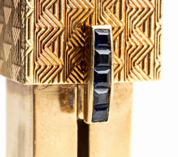 of rectangular shape, in 18k yellow gold decorated with geometric motifs, clasp set with 5 sapphires, square, carré cut. Hallmarked "S. BVULGARI - 750" and English import hallmarks.