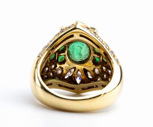 18k yellow gold band, floral motif embellished by emeralds and diamonds.