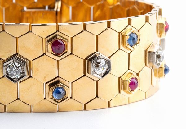 Diamond ruby sapphire gold beehive bracelet - - 1950s