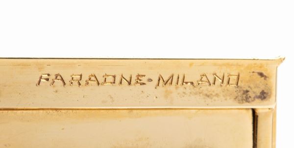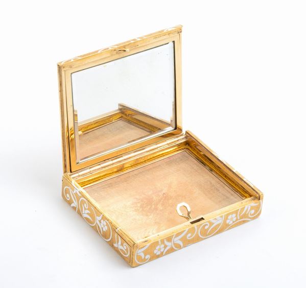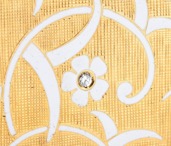18k yellow gold, satin motif, rectangular shape, with a satin finish, decorated with a white enamel ramage and floral motif, highlighted by diamonds. With interior mirror. Signed FARAONE.
