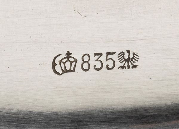 oval foot and plain shaft, three-flame top with intertwined arms, detachable nozzle. 835/1000 silver hallmarked with the marks in use in Germany after 1888, siversmiths Bruckmann & Söhne, Lerchenstraße.