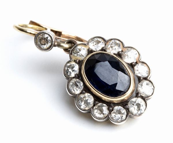 Gold and silver earrings in floreal motif with sapphires and Old Cut diamonds