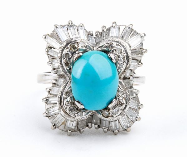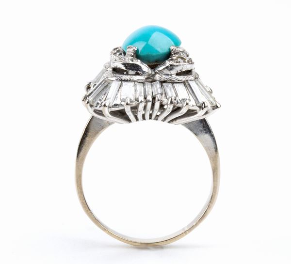with a ballerina setting with a turquoise cabochon in the centre surrounded by diamonds.