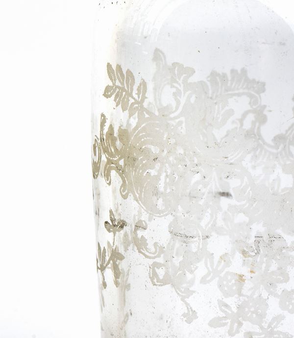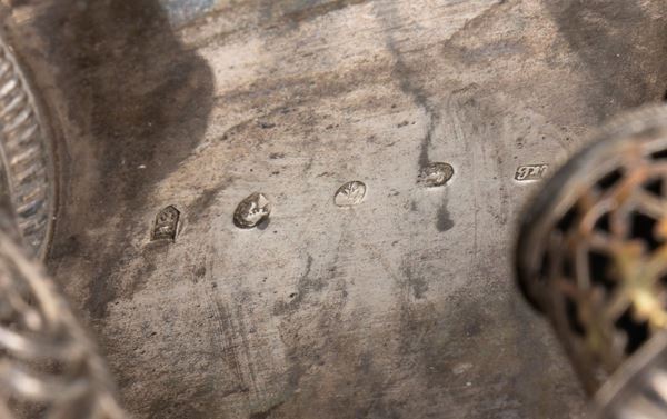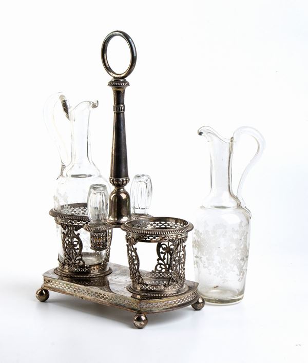 of shaped form with openworked geometric and foliate decorations, resting on four ball feet; central handle with two side cruets in glass. Hallmarked with unidentified marks.