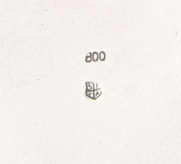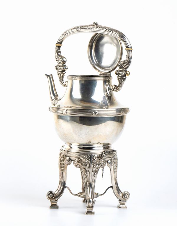 of circular shape with plain body, resting on three curly feet topped with acanthus leaves. 800/1000 silver, hallmarked '800' and silversmith unidentified. Hinged lid, folding handle with aetheric bone spacers.