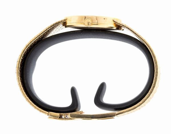 oval case with integrated 18k gold bracelet, black dial with baton hour markers and gilded hands, manual winding mechanical movement calibre 1600.
