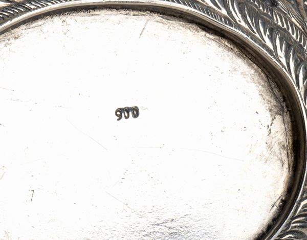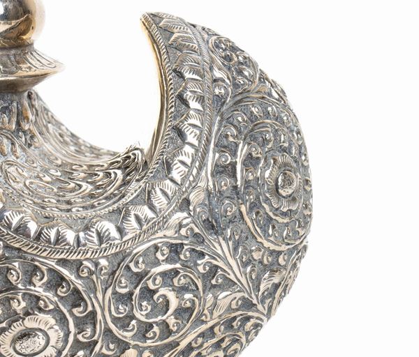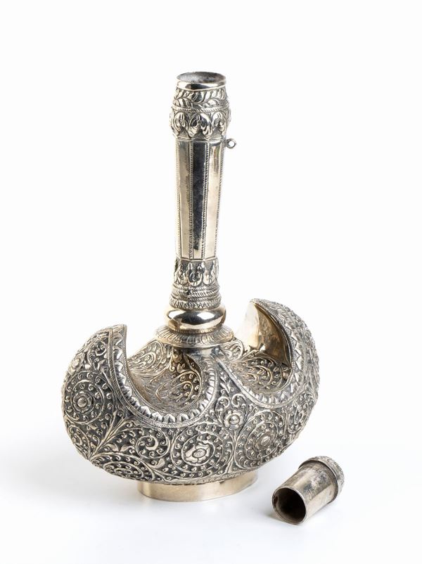 Dating from the British colonial rule of India, this flask is richly decorated with embossed and chiselled whirls and floral volutes; the neck rising to the stopper is decorated with acanthus leaves. 900/1000 hallmarked 900.