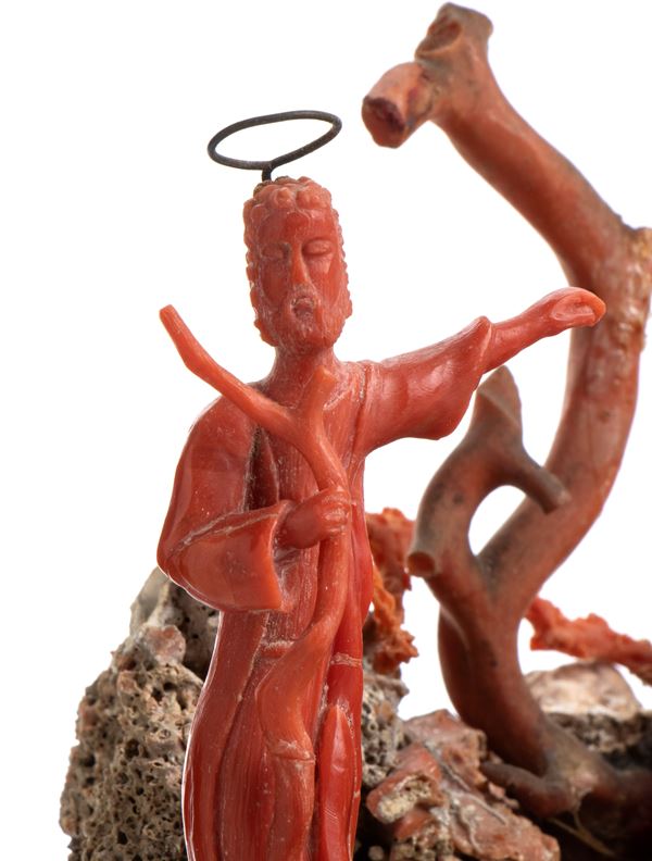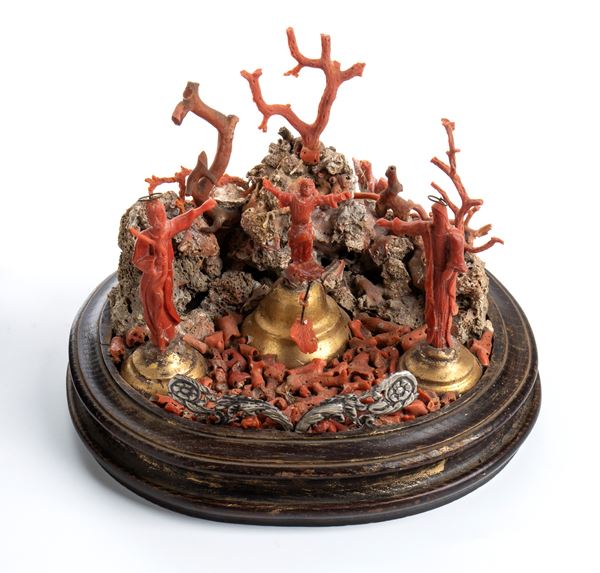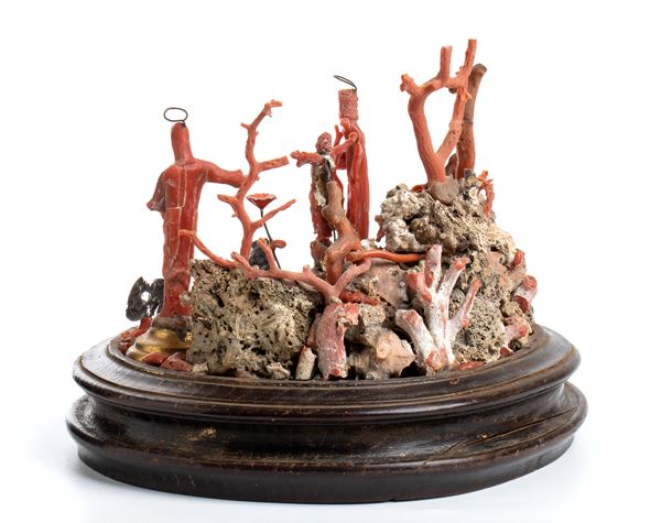 The nativity scene rests on an oval wooden base in which are inserted the characters of the sacred representation entirely carved in red Mediterranean coral (Corallum rubrum, Linneo 1758), which is also present in rough twigs as decoration and to create a setting.