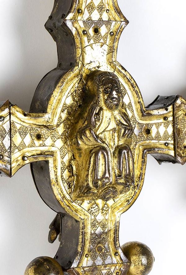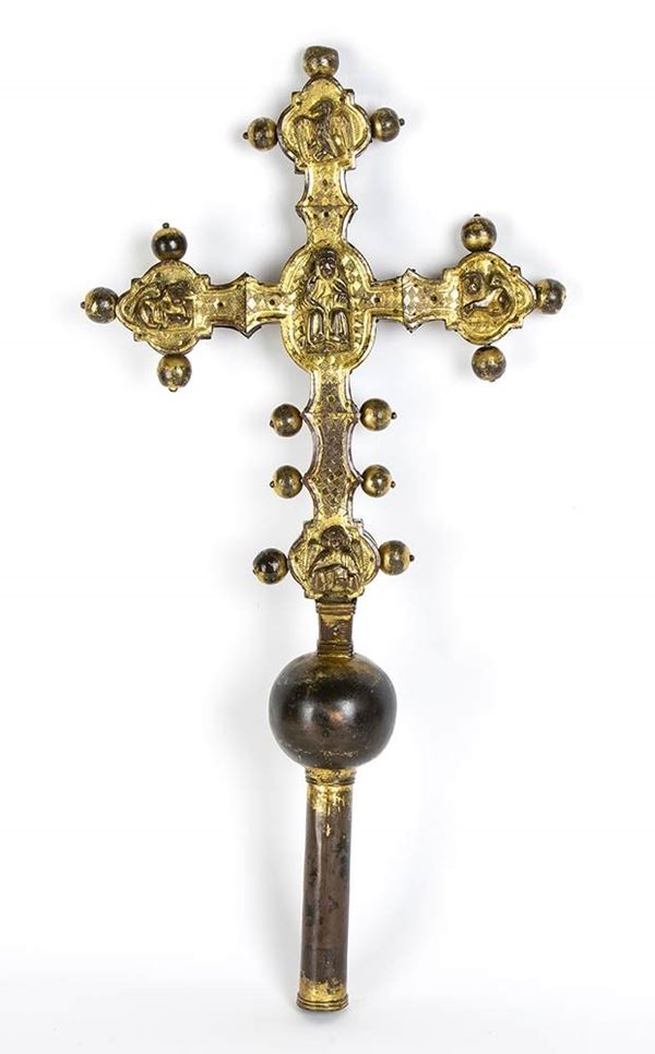 embossed, chiselled and gilded copper sheet on a gilded cast metal core.The finely decorated cross has a Latin cross structure, with the arms having sharp profiles and poly-lobed finials; both faces are decorated with a rhomboid checkerboard motif on a punched background.On the front, the figure of Christ crucified on a thin cross appears at the intersection of the arms, while in the embossed side panels one can see the half-busts of Mary and John, at the top an angel and at the bottom Mary Magdalene. On the front, on the other hand, God the Father is depicted in the centre, blessing the whole figure, and on the four terminals the animal symbols of the Evangelists: at the top the eagle representing John, at the bottom the angel, symbol of Matthew, on the right the lion of Mark, and on the opposite side the bull, symbol of the Evangelist Luke. Worthy of note, on the reverse side, is the figure of Christ in the centre, which is based on an archaic model. The general design of the cross falls within current modules: the edges are wavy, the intersection of the arms is connected by an outline, the backgrounds are decorated.The work is part of the vast repertoire of 15th-century Lombardy processional crosses characterised by this type of structure and decoration. In the case proposed here, a certain archaism can be noted, both in the style of the images and in the technique of creating the embossed figures directly from the background sheets, i.e. not by applying the panels to the metal surfaces that completely cover the arms of the object.