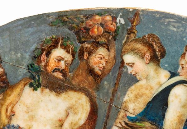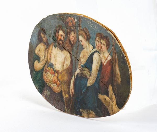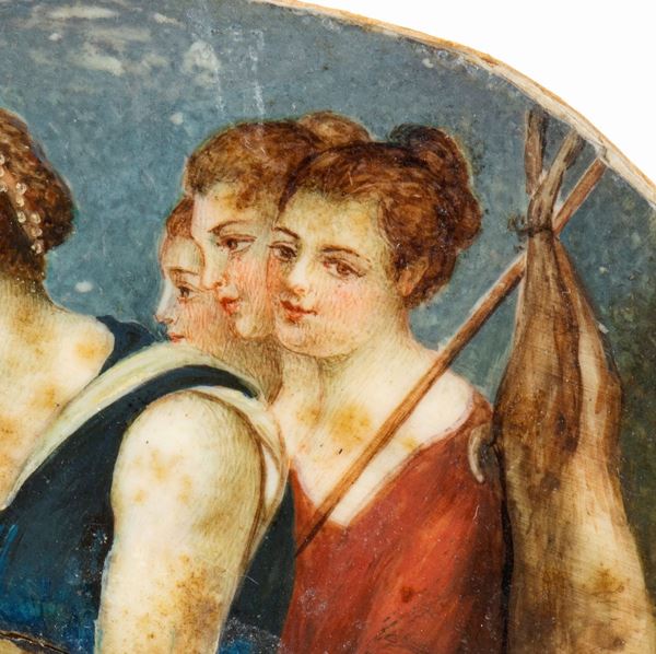 Painted elephant ivory (Elephas maximus Linnaeus, 1758 o Loxodonta africana Blumenbach, 1797) plaque represents a group of Satyrs and Nymphs with the figure of Diana in the center. Probably made at the end of the 18th century.