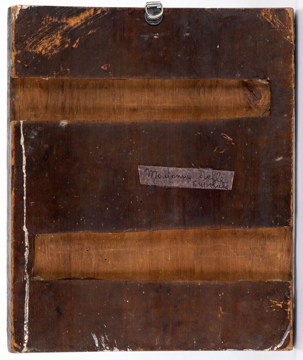 Russian icon with figuration of Unexpected Joy. This icon was first developed in the 18th century in Russia and is inspired by a story written by Dimitrij, the holy bishop of Rostov. It tells of a sinner who, despite his crimes, never failed to repeat several times a day the greeting of the angel Gabriel to Mary before the icon of the Mother of God. One day, while he was meditating on doing an evil action, he saw the wounds on the side and hands of the baby Jesus opening and bleeding. The man lingered and asked, ''Lord who did this to you?" and the Mother of God replied, ''You and other sinners continue to crucify with your sins my Son as the Jews did.'' The man remained in prayer for a long time and after kissing the bleeding wounds of Christ, he obtained forgiveness and the unexpected joy of repentance and salvation. Below the icon is the parchment where the beginning of Dimitrij Rostov's account is transcribed.