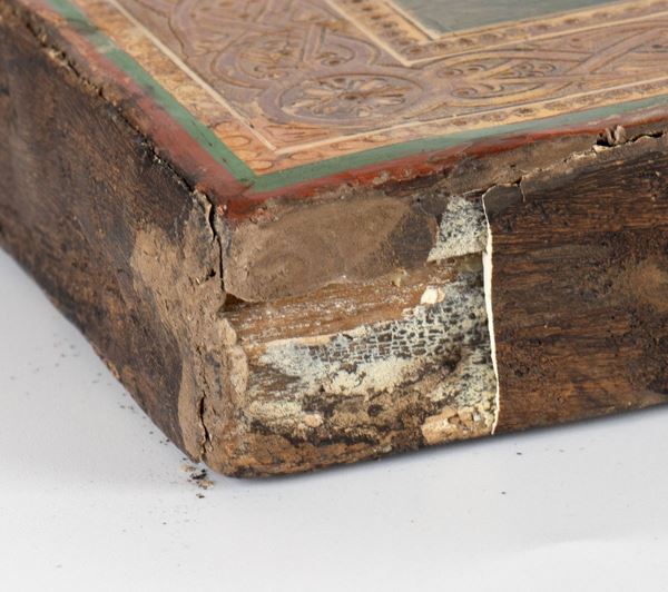 Divided into nine aediculae with a frame of interlaced and beaded decoration, within which various saints are depicted, including St. Mark, St. Valentine, St. Sophia and the Archangel Michael.