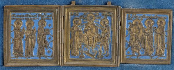 - Small tripartite travel icon made in bronze and enamels with scenes of saints.