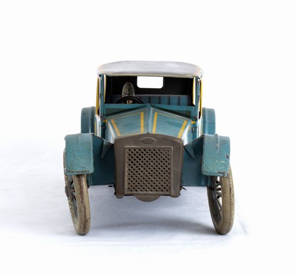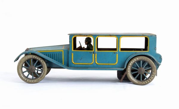 Giant model limousine car, by Leonida Alemanni (marked on the left side running board) with license plate 1879 MI, produced in the period 1924-1928. In lithographed sheet metal, with spring-loading mechanism (fixed) complete with its pilot driving. right side. Spoked wheels, lithographed PIRELLI SUPERFLEX CORD 715x115. Very rare toy, in perfect condition, probably never played.