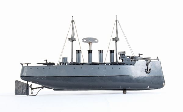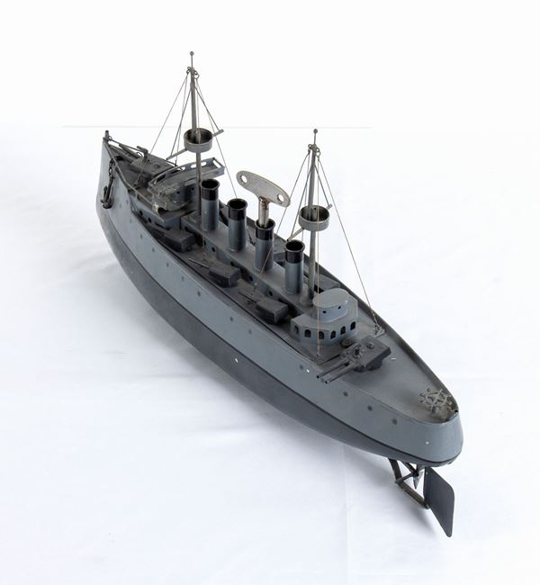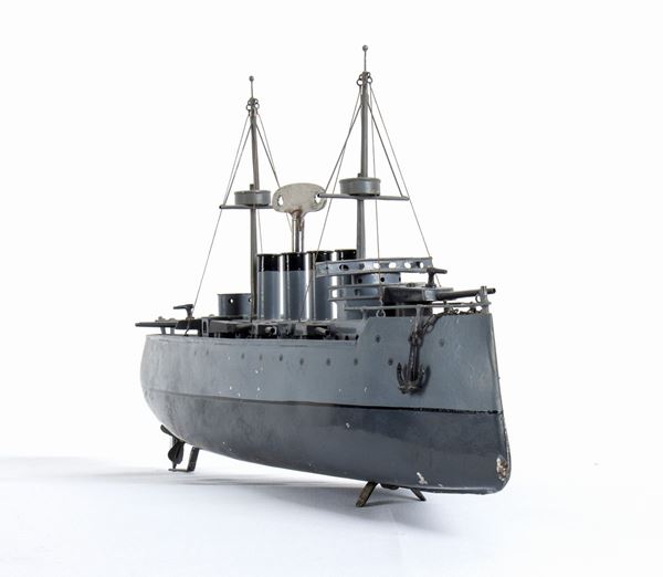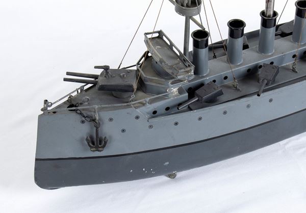 War cruiser, tin, BING Gebruder Bing Nuremberg, Germany. Superstructure with 4 funnels, 3 batteries of double guns on each side, one battery at the stern and one at the bow, two masts with sighting turrets, two anchors at the bow. Adjustable navigation rudder, working spring winding mechanism. Minor restorations, in excellent condition