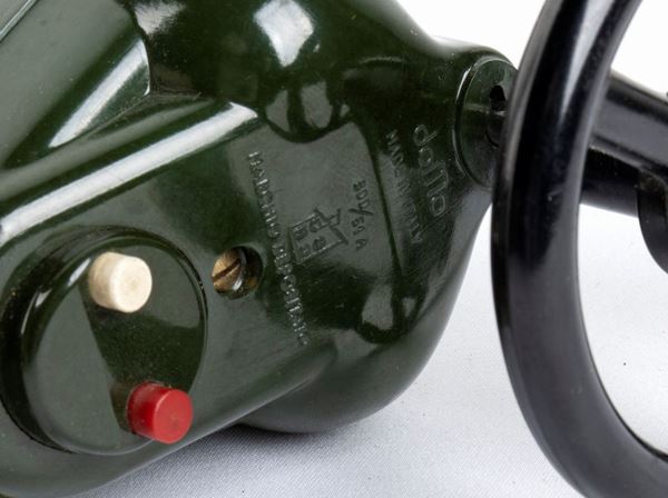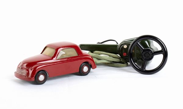 Model produced by DOMO of Bologna called PUCCY inspired by the FIAT Topolino (for obvious ownership reasons, DOMO could not explicitly call the toy with the name of Mickey Mouse) Wire-controlled, dark green Bakelite control, in original box. In very good condition, rubber tyres, studs. Marked on the caseback DOMO CAT 601/1 Made in Italy - Patented serial number 4134. Original box