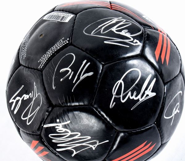 Official AC MILAN leather ball, with original autographs handwritten in white ink by the team's players from the early 2000s. Paolo Maldini, Serginho, Billy Costacurta, Leonardo, Dida, Redondo can be recognised. With hexagonal sections, black leather with AC MILAN 1899 logo. ADIDAS product model CLASSIQUE, size 5. In excellent condition
