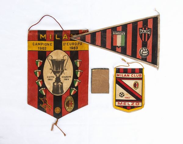 Lot of four AC MILAN gadgets, two pennants, a flag, a patch, in paper and fabric, printed, 1960s-70s. Various sizes, good condition