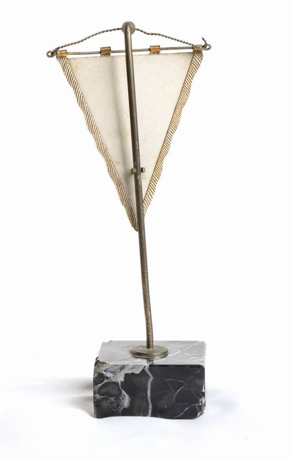 Metal gadget, small trophy of the SS LAZIO Football Club for the 1969-70 National Championship, with dedication plate from GUIDO GIAMBARTOLOMEI to RINO MARCHESI. On marble base, with chipping, flag with central chipping. From Mister Marchesi's collection
