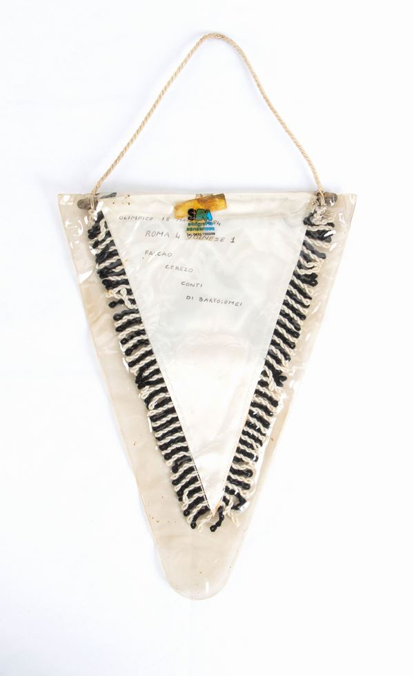 Pennant for UDINESE Calcio from 1984, in printed synthetic material, with applied fringe, notes on the back written in pen for the Roma-Udinese football match of 18 March 1984. In original packaging. Good conditions