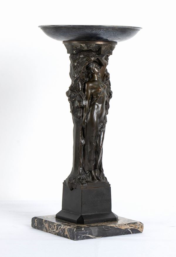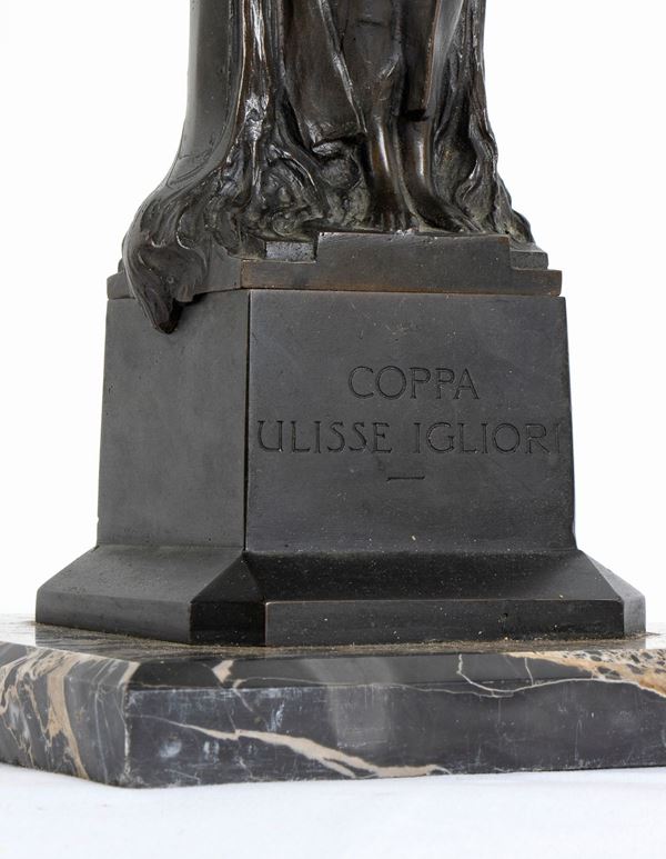 Bronze trophy, named with an engraving at the base COPPA ULISSE IGLIORI, period from the second half of the 1920s, presumably for some tournament involving football teams for regional clubs in Lazio, such as AS ROMA and SS LAZIO. Beautiful representation of two women in the guise of victory holding the cup applied to the top of the sculpture, resting on a marble base. Very good condition.