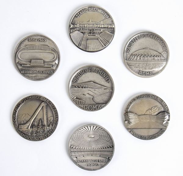 Lot of 7 C.O.N.I. (Italian National Organizing Committee) medals made by the Stabilimenti Artistici Fiorentini SAF, in silver alloy, commemorative for the Olympics. Marked S.A.F., some with the name of the engravers Manetti, Modugno. For the 1960 Rome Olympics we have the Swimming Stadium, Flaminio Stadium, Olympic Velodrome, Sports Hall, Sports Palace. For Cortina we have the medals from Trampolino Italia, Stadio del Ghiaccio. Brilliant uncirculated, diameter approximately 55mm