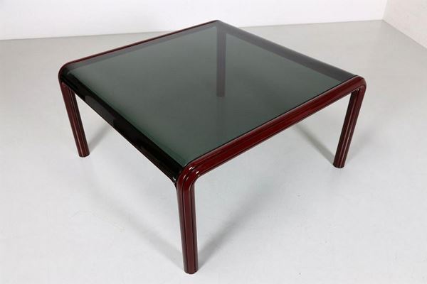 Dining table by Gae Aulenti for Knoll made in the 1970s. Curved glass top; brand label visible; small scratches on the glass.
