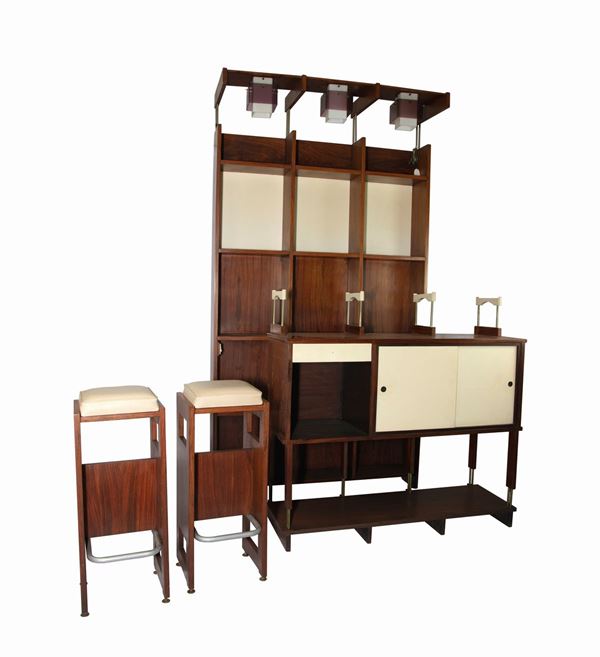 Bar set composed of counter, rear counter and two stools in walnut, skai, brass, lacquered wood, beveled crystal. Spotlights in opal Perspex and colored transparent Perspex.