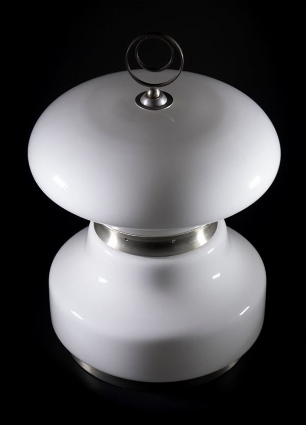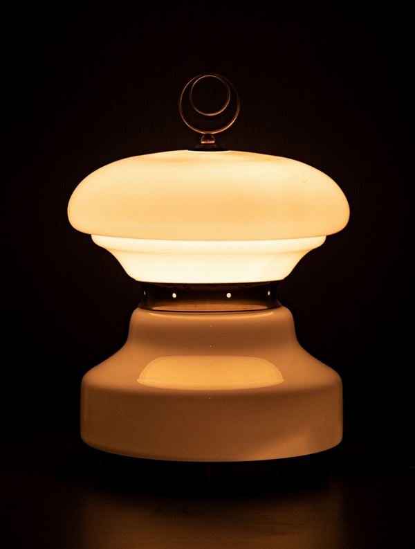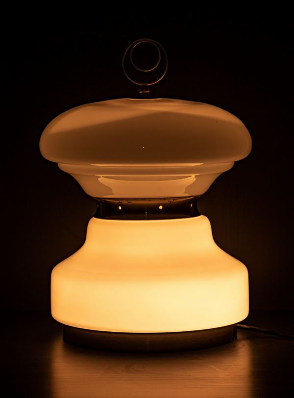 A beautiful vintage lamp composed of two modules that can be switched on together or individually realized in white glass