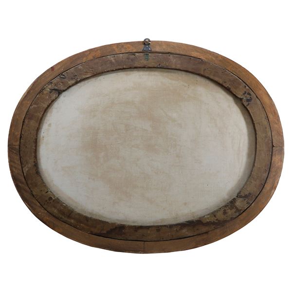 oval structure within a gilded wooden frame, reupholstered.