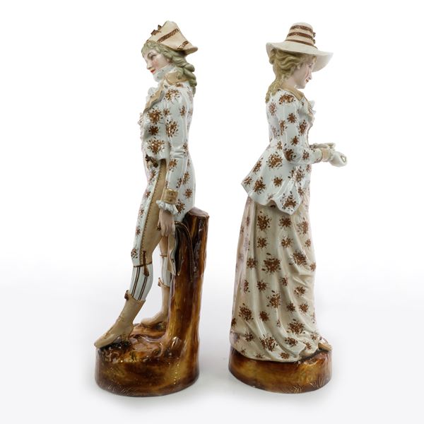 Lady and Gentleman, volume sculpture in polychrome porcelain, France second half of the 20th century