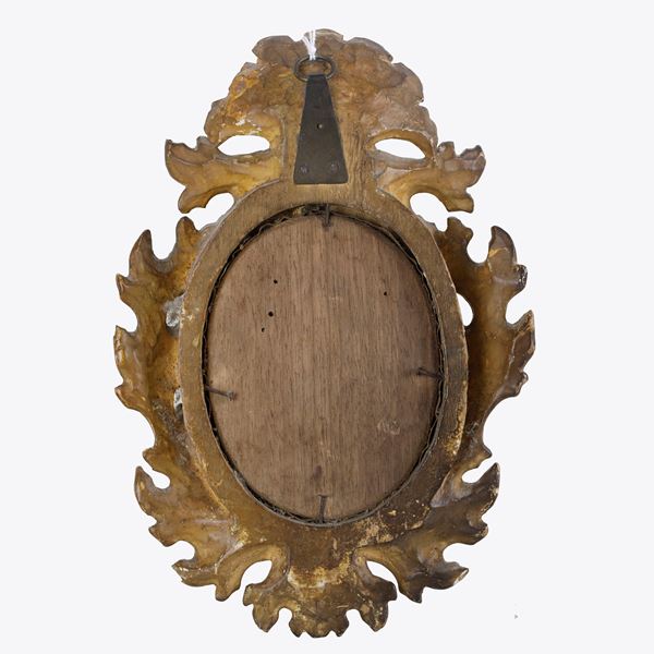 with an oval structure within a golden line frame carved with vegetal motifs. Small defects on the frame