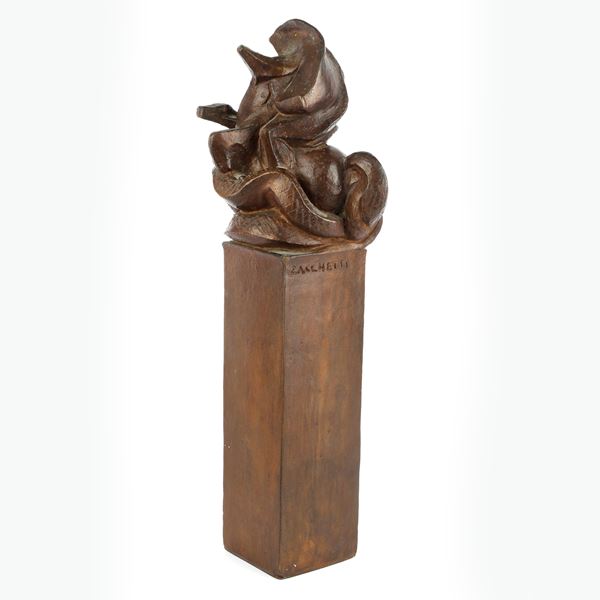 Saint George and the dragon, volume sculpture in bronze with brown patina