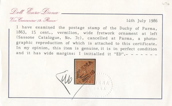1854 - 15 cent. vermiglio con la greca sinistra larga n.7c. (A+) ( cert. En. Diena)