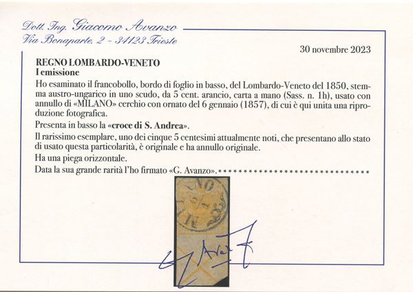 1850 - 5 cent. arancio n.1h con bordo di foglio inferiore e croce di S.Andrea. Quinto esemplare noto, inedito. (A-)