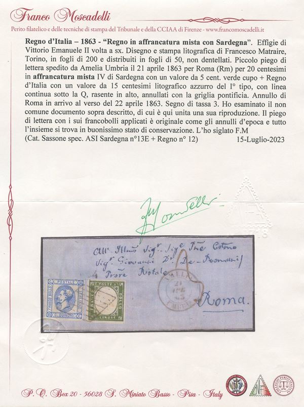21.04.1863 - Lettera da Amelia per Roma affrancata per 20 centesimi tramite un 5 cent. della IV emissione di Sardegna n.13Da e un 15 cent. del Regno D'Italia n.12. La lettera รจ attraversata da una piega. (B) (Cert. Moscadelli)