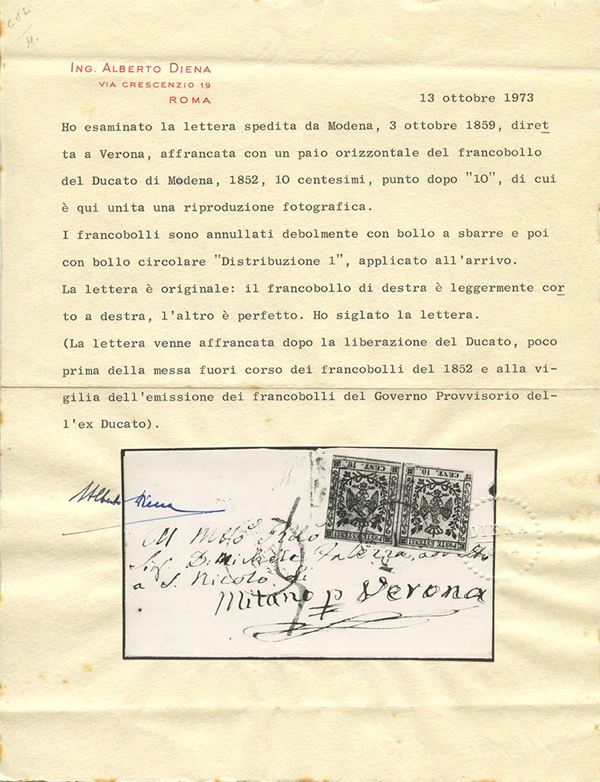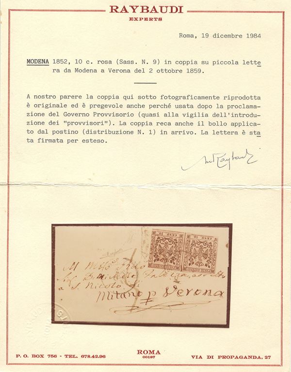02.10.1859 - Lettera da Modena per Verona affrancata con una coppia di 10c. N.9. Raro l'uso dopo la proclamazione del governo provvisorio. (A-) (Cert. Alberto Diena, Cert. Raybaudi, Enzo Diena).