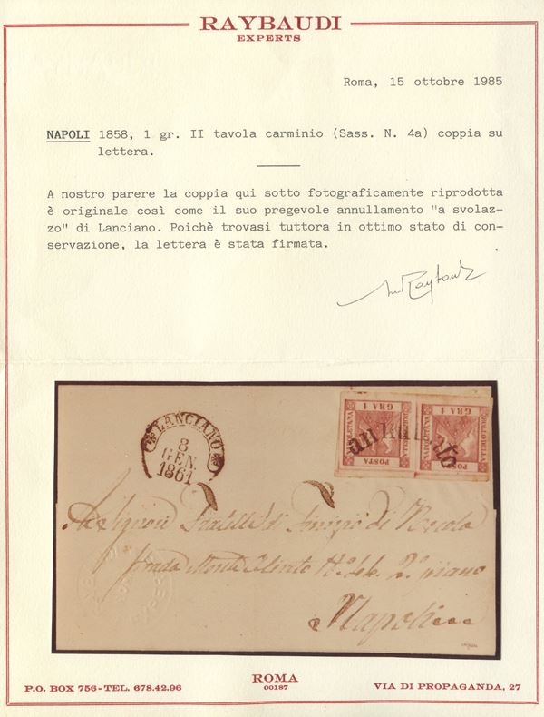 08.01.1861 - Lettera da Lanciano per Napoli affrancata per 2gr. tramite una coppia di 1gr. carminio n.4a. Sull'affrancatura lo svolazzo tipo 9 di LANCIANO (11pt.) (A+) (Cert. Raybaudi)