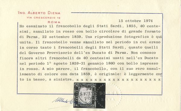 1859 - 40 cent. rosso scarlatto n.16A usato a Parma il 22 Settembre 1859 tramite il doppio cerchio grande di parma in rosso. Riprendendo quanto scritto nel certificato da Alberto Diena รจ probabilmente l'unico esemplare noto con tale tipo di annullamento. (A-) (cert. Alberto Diena)