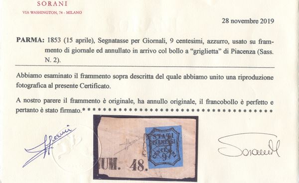 1853 - 9 cent. azzurro n.2 usato, conservato su frammento di giornale ed annullato tramite la griglietta di Piacenza. (A+) (Cert. Sorani)
