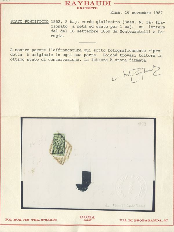 16.09.1859 - Lettera da Montecastelli per Perugia affrancata per 1 baj tramite un 2 b. verde giallastro n.3a frazionato a metร  verticalmente. (A+) (Cert. Raybaudi)