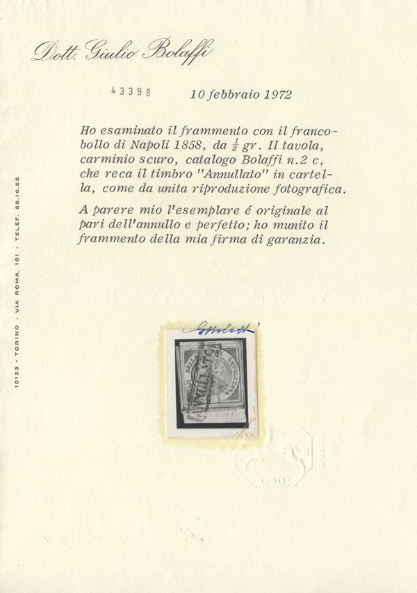 1858 - 1/2 gr. carminio scuro, usato. Splendido. (LUX) (Cert. Bolaffi)