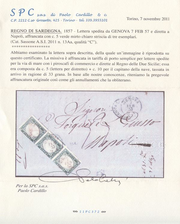 07.02.1857 - Lettera da Genova per Napoli affrancata per 15 centesimi tramite una striscia di tre del 5 cent. verde mirto chiaro n.13Aa. (C) (Cert. Cardillo)