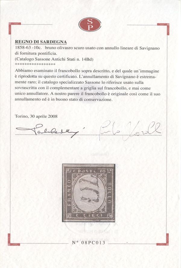 1860 - 10 cent. bruno olivastro scuro n.14Bd. (B) (cert. SP)