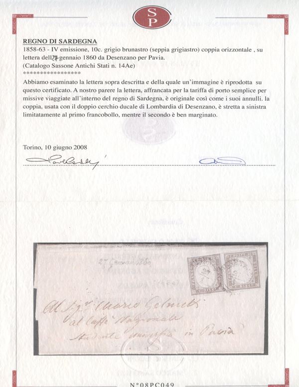 27.01.1860 - Lettera da Desenzano per Pavia affrancata per 20 centesimi tramite una coppia orizzontale del 10 cent. grigio brunastro (seppia grigiastro) n.14Ae. (A-) (Cert. Studio Peritale Collezionistico)