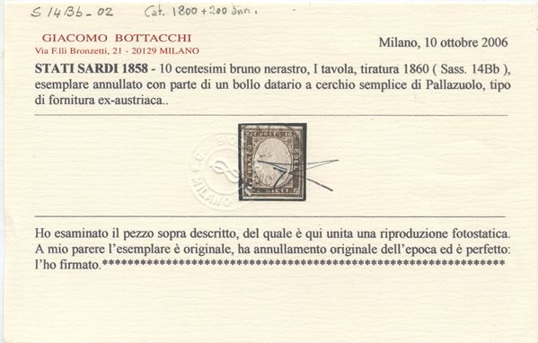 1860 - 10 cent. bruno nerastro n.14Bb usato con il C1 di Palazzuolo (9pt.). Insieme non comune. (A) (cert. Bottacchi)